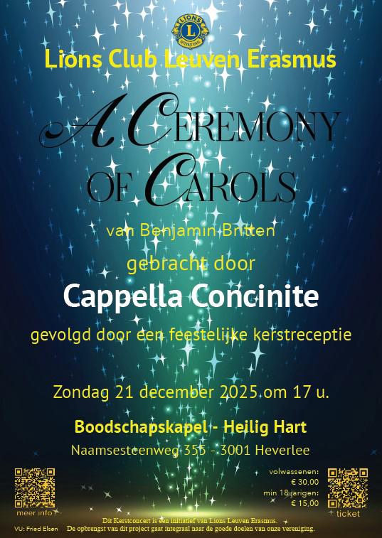 Kerst. Wintertijd. In deze donkere dagen komen we samen om licht te brengen en warmte te delen. Hoe kan dat beter dan door samen te zingen? Vrouwenkoor Cappella Concinite ontsteekt het muzikale vlammetje met Benjamin Brittens ´A Ceremony of Carols´ met Kyle Desantoine op harp. Dit prachtige koorwerk wordt gevolgd door sfeervolle bewerkingen van Engelse en Vlaamse kerstliederen, van o.a. Mendelssohn, Van Nuffel en De Vocht. Laat je meevoeren door de magie van samenzang, met Joris Ceoen aan het orgel. Een avond vol gezelligheid, verwondering en kerstlicht voor iedereen die het hart wil verwarmen.